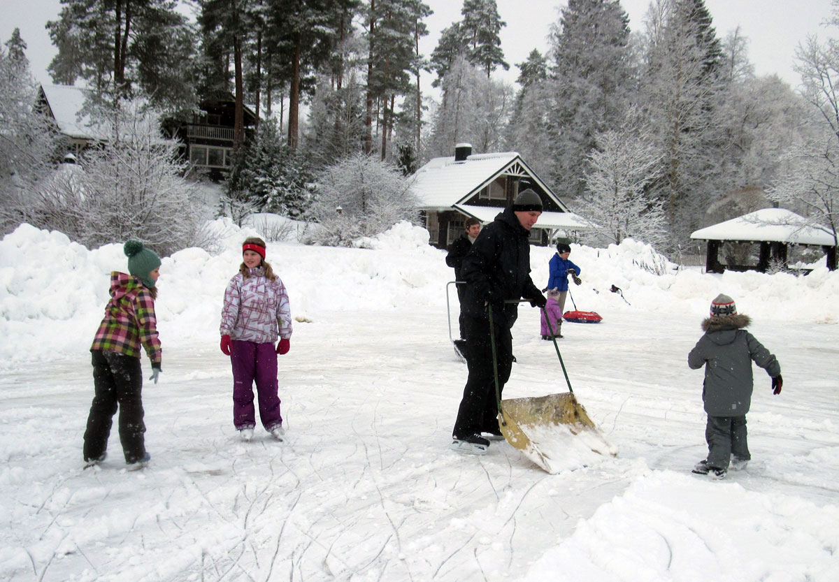 Дом наш оказался большим и немного запутанным — лестница на второй этаж проходила по улице. Стоял он на краю большого озера Pyhajarvi. Что в переводе с финского значит Священное озеро. Почему так — неизвестно. Но озеро популярно у рыбаков. Никто из нас подледной рыбалкой, к сожалению, не увлекался. А из лунок натекала под снег вода. На озере много островов. На каждую лыжную прогулку мы выбирали целью один из них.